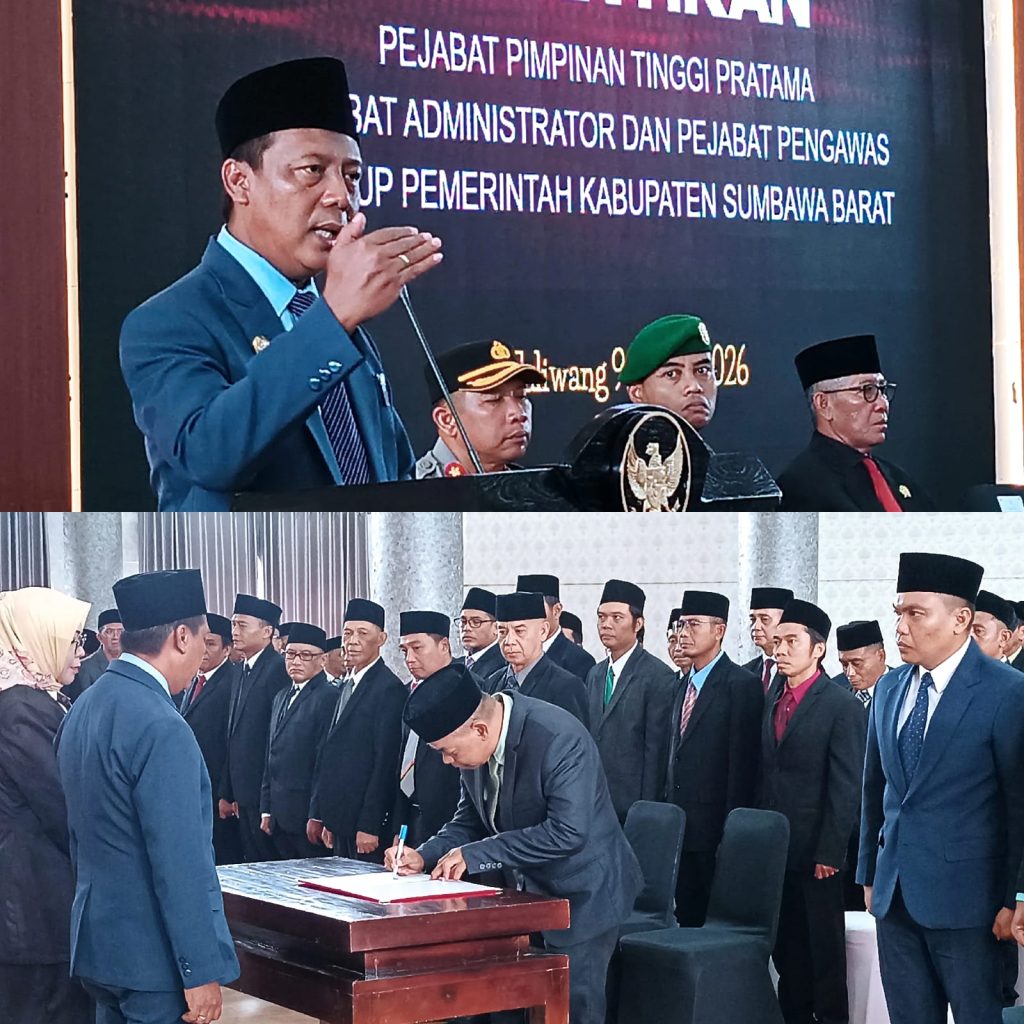 Taliwang – Pelantikan 41 pejabat pimpinan tinggi pratama, administrator, dan pengawas di lingkungan Pemerintah Kabupaten Sumbawa Barat digelar di Graha Praja, Taliwang, Senin (09/03). Prosesi pengambilan sumpah jabatan tersebut dipimpin Bupati Sumbawa Barat H. Amar Nurmansyah, S.T., M.Si. sebagai bagian dari penataan organisasi dan penguatan kinerja perangkat daerah. Kegiatan ini turut dihadiri Wakil Bupati Hj. Hanipah, S.Pt., M.M.Inov., Sekretaris Daerah drh. Hairul, M.M., jajaran asisten, pimpinan OPD, serta keluarga pejabat yang dilantik.