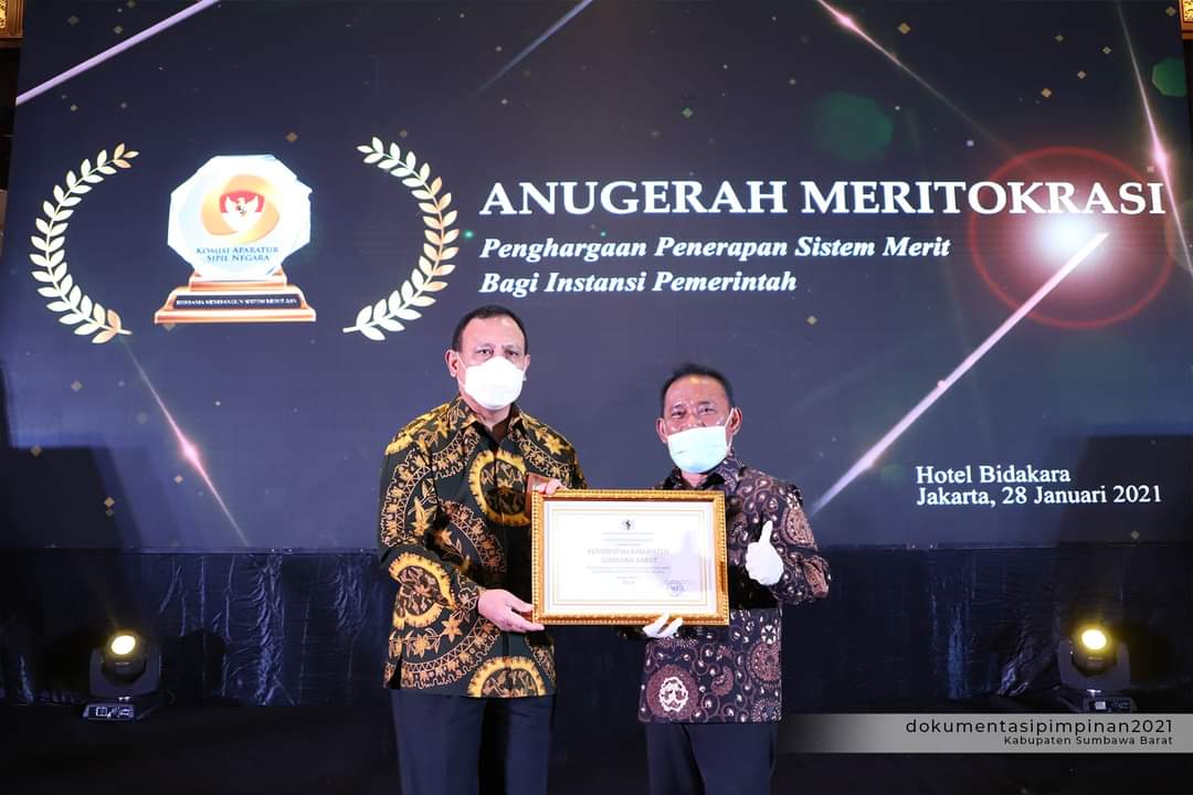 Jakarta. Kabupaten Sumbawa Barat mendapatkan Penghargaan Penerapan Sistem Merit di Instansi Pemerintah dari Komisi Aparatur Sipil Negara (KASN) dengan predikat “Baik”. Bupati Sumbawa Barat Dr. Ir. H. W. Musyafirin, M.M., menerima langsung penghargaan tersebut dari Ketua KPK RI, Firli Bahuri yang didampingi Ketua KASN Agus Pramusinto di Birawa Assembly Hall, Hotel Bidakara, Jakarta, Kamis (28/1/2021). Acara bertajuk Anugerah Meritrokrasi tersebut dihadiri juga secara virtual oleh Wakil Presiden RI Ma’ruf Amin.