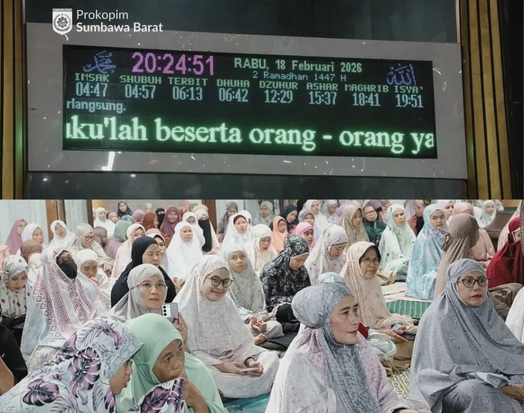 Taliwang – Setelah penetapan 1 Ramadhan 1447 H/2026 M oleh Kementerian Agama RI yang jatuh pada Kamis, 19 Februari 2026, Kabupaten Sumbawa Barat menyambut bulan suci ini dengan penuh kekhidmatan. Wakil Bupati Sumbawa Barat, Hj. Hanipah, S.Pt., M.M.Inov, mengawali Ramadhan 1447 H dengan melaksanakan ibadah shalat tarawih di Masjid Agung Darussalaam, KTC pada Rabu (18/2/2026).