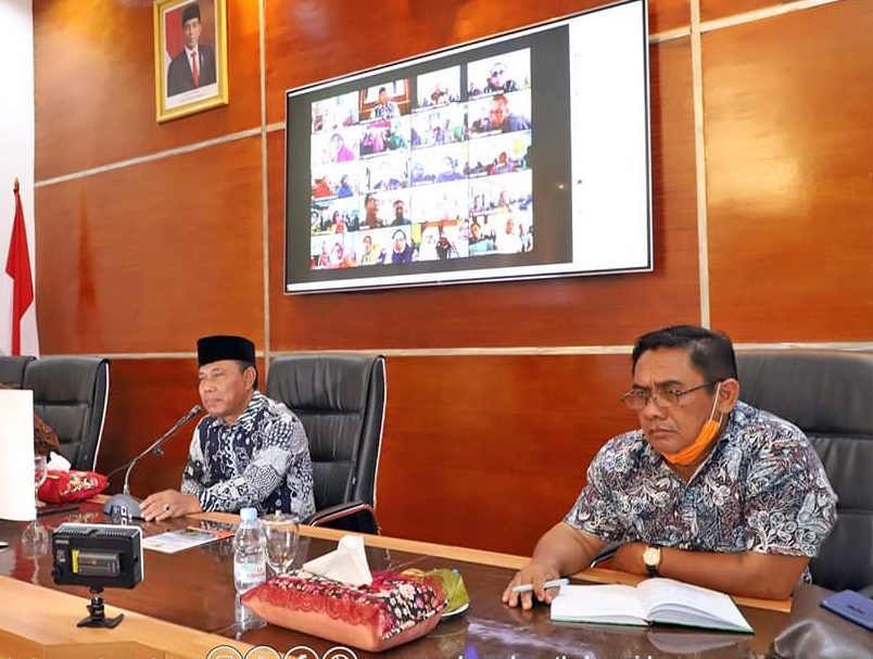 Dr. Ir. H. W. Musyafirin, M.M., Bupati KSB didampingi oleh Sekretaris Daerah KSB dan Inspektur Inspektorat Daerah KSB menghadiri kegiatan Monitoring dan Evaluasi Program Pemberantasan Korupsi Terintegrasi Pemerintah Provinsi Nusa Tenggara Barat (NTB) melalui video conference bertempat di Ruang Rapat Utama Graha Fitrah, Kamis (30/04) pagi.