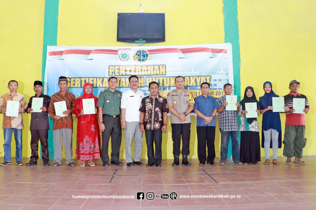 Bupati sumbawa barat H. W. Musyafirin, M.M. menyerahkan sertifikat kepemilikan atas tanah kepada masyarakat kecamatan maluk pada hari Kamis (11/4/2019). Sertifikat tersebut diserahkan kepada delapan orang warga yang menjadi perwakilan. Hadir dalam acara tersebut Kapolres Sumbawa Barat bapak AKBP Mustofa S. IK., MH, Kepala Kantor Pertanahan Kabupaten Sumbawa Barat Bapak I Nyoman Nelson Giri, S.H.,M.H., Dandim 1628/Sumbawa Barat yang diwakili oleh Kapten Agus dan Camat Maluk.