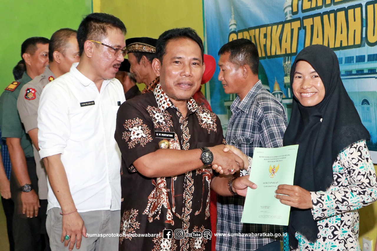 Bupati Sumbawa Barat, Dr. Ir. H. W. Musyafirin, M.M., dalam sambutannya mengatakan bahwa penerbitan sertifikat ini memiliki banyak manfaatnya. Diantaranya adalah untuk mengurangi masalah sengketa pertanahan, meningkatkan pendapatan asli daerah melalui pajak tanah dan transaksi BPHTB (Bea Perolehan Hak atas Tanah dan Bangunan). Bagi masyarakat, Sertifikat kepemilikan tanah bukan saja menjadi bukti atau alas kepemilikan yang sah akan tetapi bisa dijadikan agunan untuk memperoleh kredit usaha melalui perbankan.