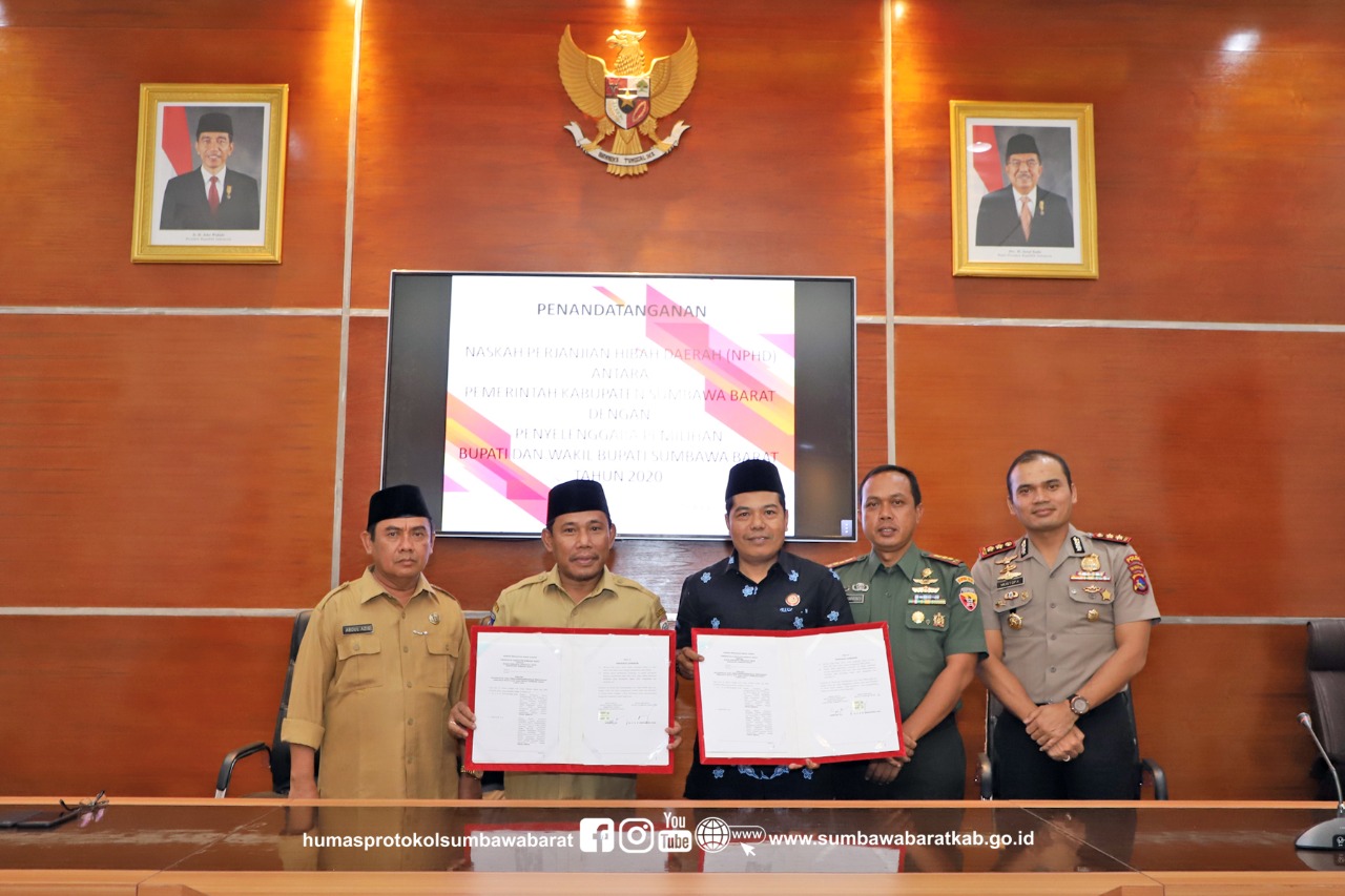 ersama tiga pimpinan instansi penyelenggara pemilihan Bupati dan Wakil Bupati Sumbawa Barat, yakni Kapolres Sumbawa Barat, Ketua Badan Pengawas Pemilu (Bawaslu) KSB, dan Ketua Komisi Pemilihan Umum (KPU) KSB, Bupati Sumbawa Barat Dr. Ir. H. W Musyafirin, M.M menandatangani Naskah Perjanjian Hibah Daerah (NPHD) tentang penyelenggaran pemilihan Bupati dan Wakil Bupati Sumbawa Barat Tahun 2020. Kegiatan dilaksanakan di Ruang Rapat Utama Gedung Graha Fitrah, Selasa siang (1/10/19).