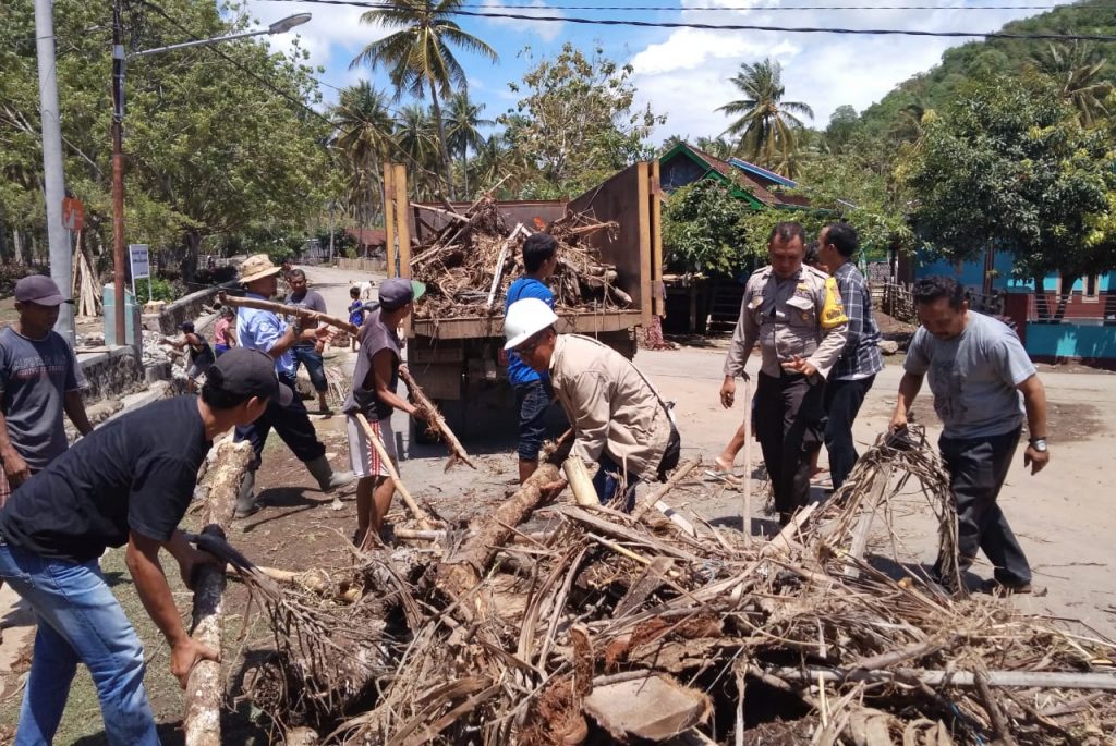 Bupati meninjau Desa Kertasari usai melaksanakan sholat dzuhur berjamaah di Masjid Agung Darussalam. Bupati yang didampingi Kepala Badan Penanggulangan Bencana Daerah (BPBD) KSB melihat warga, Babinsa, Bhabinkamtibmas dan Pol PP yang bergotong royong membersihkan ranting kayu dan sampah di pinggir jalan.