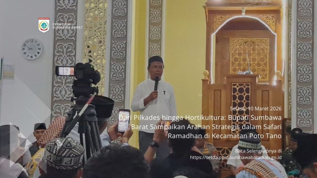 Poto Tano, 10 Maret 2026 – Pemerintah Kabupaten Sumbawa Barat (KSB) melanjutkan agenda Safari Ramadhan guna mempererat silaturahmi dengan masyarakat sekaligus menyampaikan program-program strategis daerah. Kali ini, Bupati dan Wakil Bupati KSB menyambangi Kecamatan Poto Tano, bertempat di Masjid Nurul Iman, Desa Senayan. Acara yang dimulai dengan berbuka puasa bersama itu dihadiri pula oleh Asisten Perekonomian dan Pembangunan, Syahril, S.T., Kapolres, Dandim 1628, Camat Poto Tano, jajaran kepala OPD, Kepala Desa, serta tokoh masyarakat setempat.
