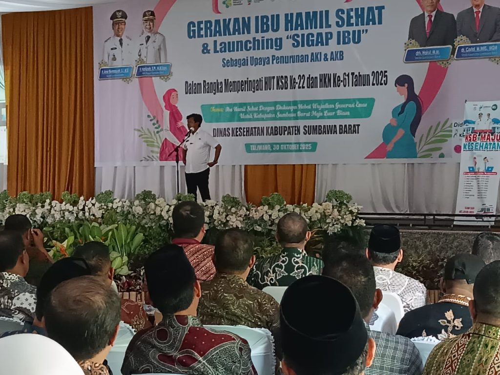Taliwang, 30 Oktober 2025 — Bupati Sumbawa Barat menghadiri dan membuka acara Gerakan Ibu Hamil Sehat sekaligus meluncurkan aplikasi SIGAP Ibu sebagai inovasi layanan kesehatan ibu dan anak yang diselenggarakan oleh dinas Kesehatan Kabupaten Sumbawa Barat didampingi langsung oleh Kepala Dinas Kesehatan dr. Carlof, M.MRS., MQM. Kegiatan yang berlangsung di Gedung Bukit Bintang, Taliwang ini dilaksanakan dalam rangka memperingati HUT Kabupaten Sumbawa Barat ke-22 dan Hari Kesehatan Nasional ke-61 Tahun 2025. Acara dihadiri pula oleh Direktur RS Asy-Syifa’ Andy Suhaeri, S.ST., M.M.Inov, Kepala Kantor Kementerian Agama H. Lalu Suhaili Fathanah, S.Pd, jajaran organisasi profesi dan organisasi wanita, perangkat desa, kelurahan, kecamatan, perwakilan puskesmas, serta para ibu hamil yang menjadi peserta kegiatan.