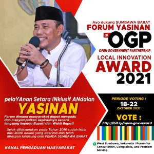 Lolosnya Forum Yasinan dalam Open Government Patnership (OGP) Local Innovation Award Asia Pacific Region akan menghantarkan Kabupaten Sumbawa Barat berada sejajar dengan daerah-daerah maju lainnya di dunia. Open Government Partnership (OGP), sebuah organisasi yang terdiri dari 78 negara di dunia, mempertemukan pemerintah dan organisasi masyarakat sipil (CSO) untuk menciptakan pemerintahan yang lebih transparan, inklusif, dan partisipatif. Misi yang diusung oleh OGP tersebut sangat relevan dengan Misi Pemerintah Kabupaten Sumbawa Barat yang diimplementasikan dalam Forum Yasinan.