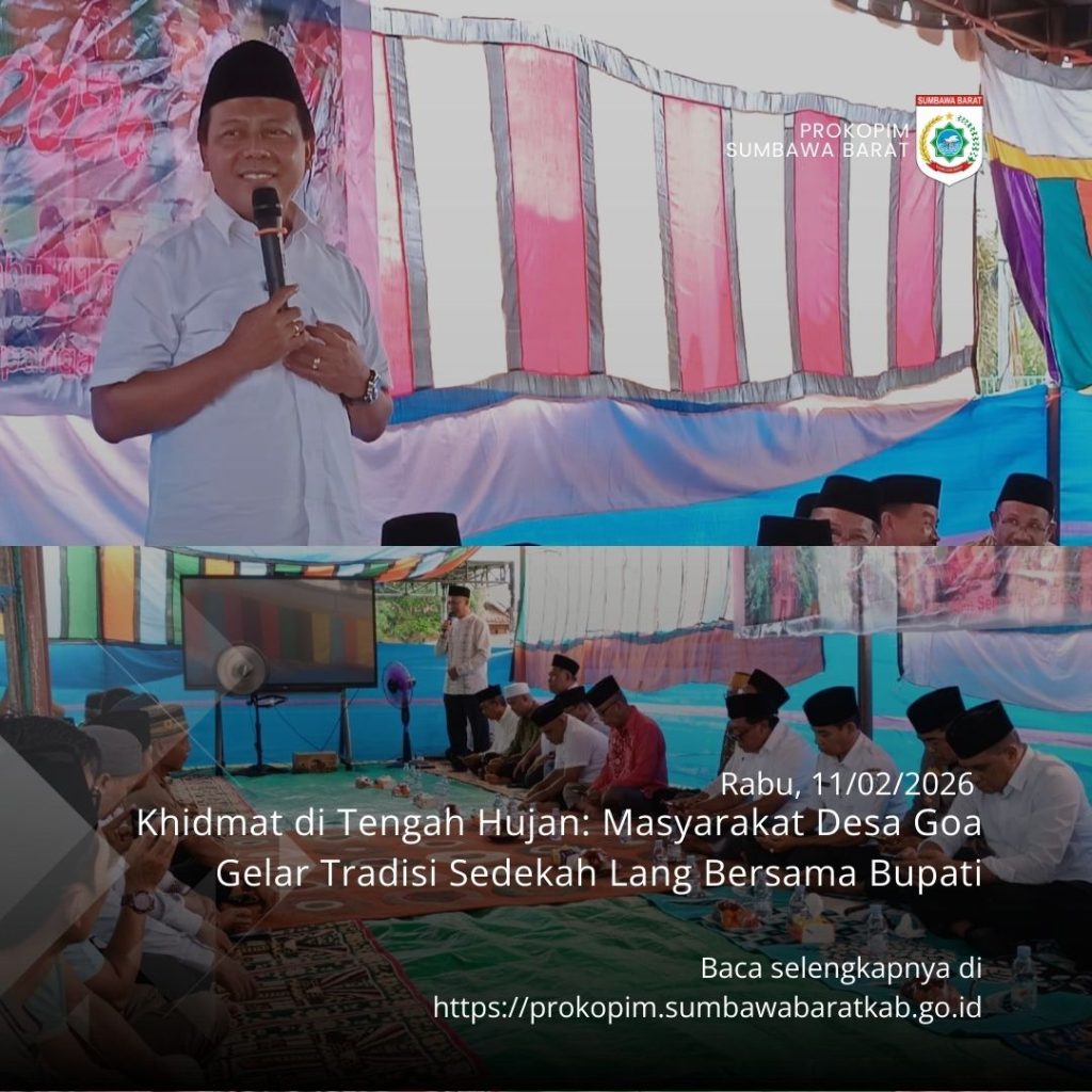 Jereweh – Bupati Sumbawa Barat menghadiri prosesi adat Sedekah Lang (Sedekah Sawah) yang digelar khidmat di Lapangan Desa Goa, Kecamatan Jereweh, Rabu (11/02). Tradisi yang dilaksanakan usai musim tanam ini menjadi momentum penting bagi masyarakat tani setempat untuk bersyukur sekaligus bersilaturahmi dengan jajaran pemerintah daerah. Turut mendampingi Bupati, Kepala Dinas PMD H. Adul Hamid, S.Pd., M.Pd., serta Kepala Dinas Dukcapil I Made Budi Artha, S.Sos., M.M.