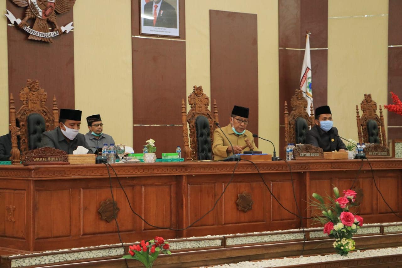 Terhadap upaya pencegahan dan penanganan Pandemi covid-19, Wabup menyampaikan bahwa Pemerintah Daerah telah melakukan rasionalisasi belanja, refocussing kegiatan dan realokasi anggaran untuk penanganan kesehatan, penguatan jaring pengaman sosial (JPS) dan pemulihan ekonomi daerah. Sementara untuk Dana Insentif Daerah Tambahan sebesar Rp.13.446.531.000, Wabup menjelaskan bahwa anggaran tersebut dialokasikan untuk mendorong pemulihan ekonomi daerah, termasuk mendukung industri kecil, usaha mikro kecil dan menengah, koperasi dan pasar tradisional serta penanganan covid-19 bidang kesehatan dan bantuan sosial. Terkait penyertaan modal Pemerintah Daerah daerah kepada BUMD, khususnya BUMD yang bergerak di sektor keuangan, seperti PT BANK NTB Syariah, dimaksudkan untuk penguatan struktur permodalan BUMD.