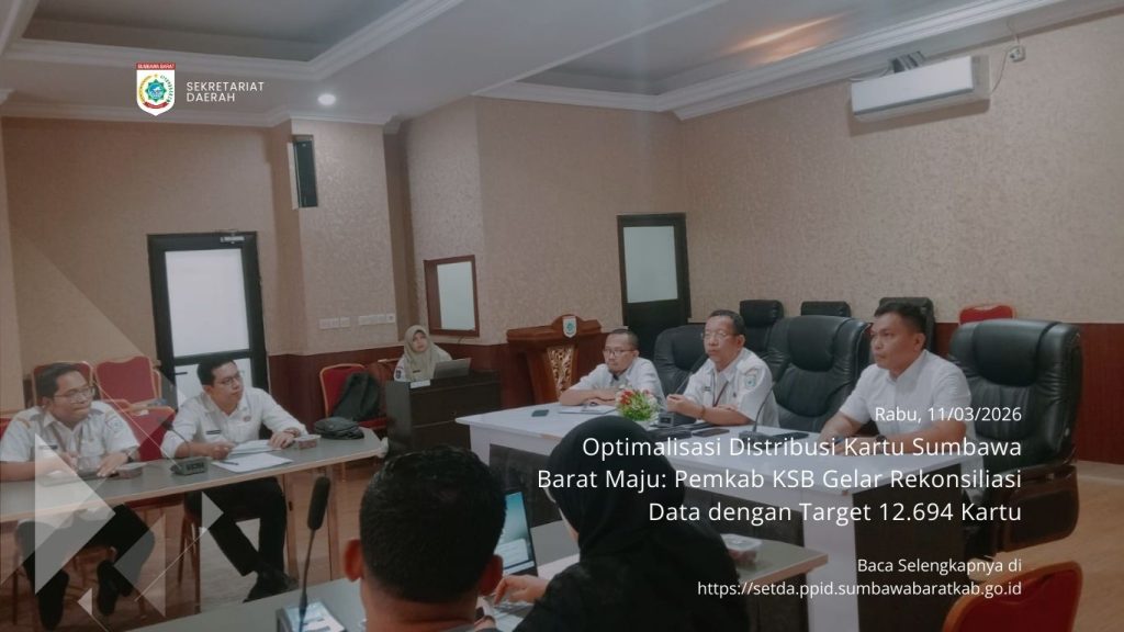 Taliwang, 11 Maret 2026 – Pemerintah Kabupaten Sumbawa Barat (KSB) terus menunjukkan komitmennya dalam mempercepat distribusi Program Kartu Sumbawa Barat Maju. Hal ini terbukti dengan digelarnya Rapat Rekonsiliasi Data Kartu Keluarga (KK) Program Kartu Sumbawa Barat Maju yang berlangsung di Ruang Rapat Gili Kenawa Sekretariat Daerah pada Rabu, 11 Maret 2026. yang dihadiri oleh Dr. H. Syaifuddin selaku Asisten Administrasi Umum, serta Hermansyah, S.T., M.Si., Kepala Bagian Administrasi Pembangunan.