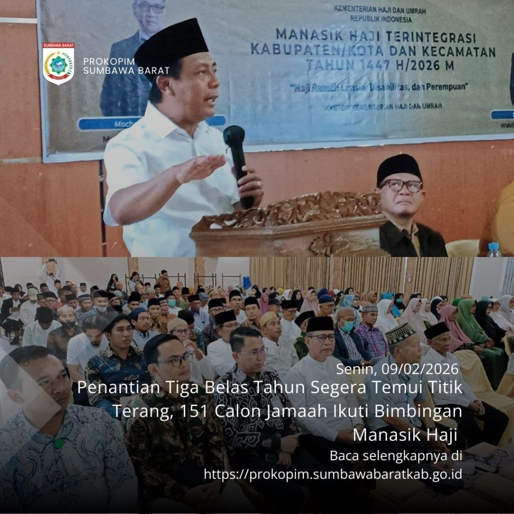 Taliwang – Bupati Sumbawa Barat, H. Amar Nurmansyah, ST., M.Si., secara resmi membuka Bimbingan Manasik Haji Terintegrasi Tingkat Kabupaten Sumbawa Barat Tahun 1447 H di Aula Hanipati, Senin (09/02). Mengusung tema “Haji Ramah Lansia, Disabilitas, dan Perempuan”, agenda ini turut dihadiri oleh Kepala Dinas Kesehatan dr. Carlof, M.MRS., Kepala Kantor Kementerian Haji dan Umrah Ardi Suzami, S.EI., M.M.Inov., serta Ketua MUI KSB Dr. TGH. Burhanuddin, SQH. Hadir pula dalam kesempatan tersebut perwakilan dari Bank BSI, Panin Bank, dan Bank NTB Syariah guna memberikan dukungan bagi para jemaah.