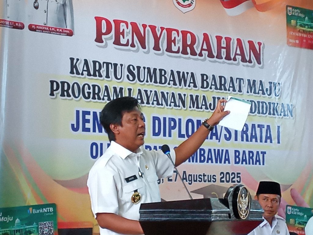 Taliwang – Bupati Kabupaten Sumbawa Barat menyerahkan Kartu Sumbawa Barat (KSB) Maju Layanan Pendidikan jenjang Diploma/Strata I gelombang pertama di Gedung Graha Praja Lantai 3, Rabu (27/8). Kegiatan dipimpin Bupati Sumbawa Barat H. Amar Nurmansyah, ST., M.Si, dan dihadiri Kepala Dinas Pendidikan dan Kebudayaan Agus, S.Pd., M.M., serta perwakilan Bank NTB; penyerahan ini merupakan bagian dari rangkaian program yang memasuki titik ke-30
