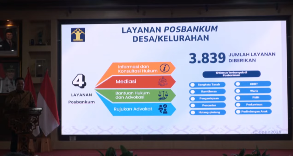 Pada kesempatan yang sama, Menteri Hukum RI Supratman Andi Agtas menekankan bahwa Posbankum merupakan komitmen bersama dalam membangun sistem keadilan yang inklusif. Program ini tidak hanya lahir dari kebijakan pemerintah, tetapi juga dari kebutuhan dan aspirasi masyarakat desa. Ke depan, Kementerian Hukum melalui BPHN akan mengembangkan sistem pelaporan yang memungkinkan pemantauan berbagai kasus yang ditangani Posbankum di setiap desa dan kelurahan.